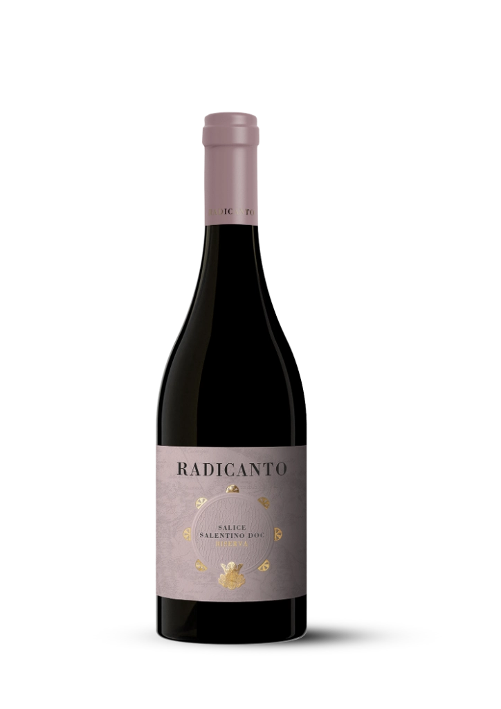 Salice Salentino DOC Riserva della linea Radicanto, rosso ottenuto da Negroamaro e Malvasia. Al naso emergono profumi intensi di frutta scura matura, amarena sotto spirito e prugna, accompagnati da spezie dolci, tabacco e una delicata sfumatura di cacao. In bocca è caldo e vellutato, con struttura importante e accenti balsamici che conducono a un finale lungo, elegante e persistente.